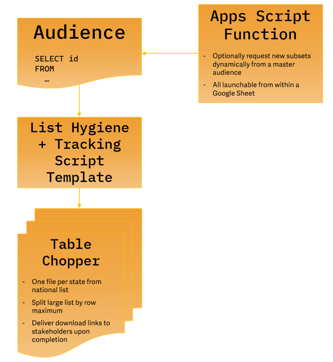 Designed and implemented shared tooling to automate list hygiene, provide point-and-click access to commonly-used filters, and dynamically prepare results for export to several different engagement platforms.
